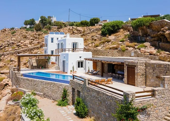 Esta villa de 160 m^2, Villa Olivia Mykonos, está situada a 2 km de la Iglesia de Panagia Paraportiani de Agios Stefanos. Esta villa está equipado con una cocina pequeña, una zona de comedor y un sofá en los cuartos.